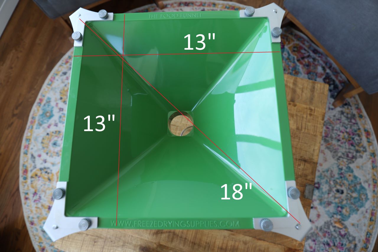 - Perfect Fit: The funnel's opening is 13"x13", allowing plenty of room for food to funnel into a container with no spills. Its diagonal opening provides an 18" space, accommodating even the XL-size freeze-dryer tray. Our food funnel specifically designed to fit into small and wide mouth mason jars.